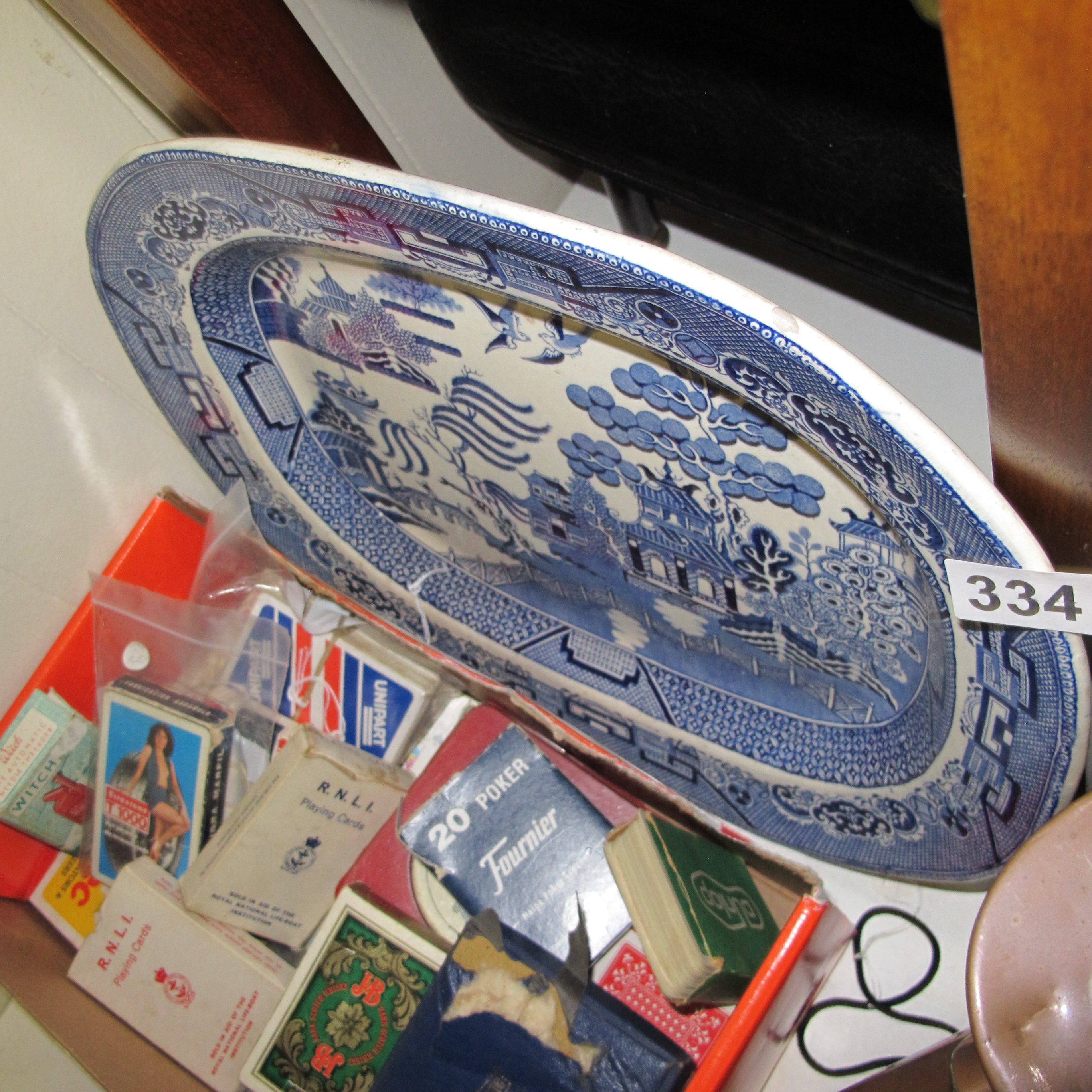 A large blue and white transfer-printed Willow pattern meat platter and a collection of vintage playing cards and ephemera