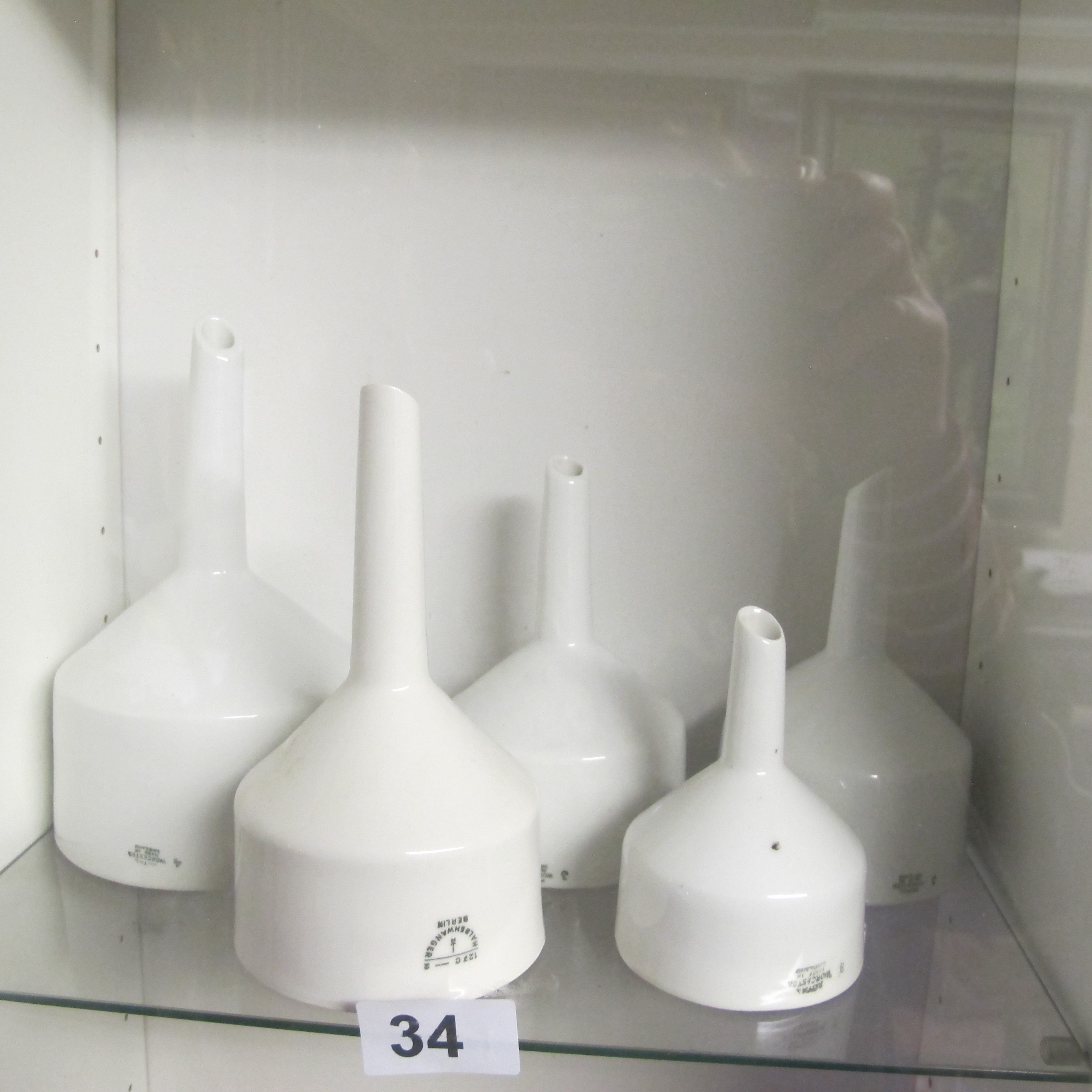 A Set of Five Royal Worcester and Haldenwanger Porcelain Buchner Laboratory Funnels
