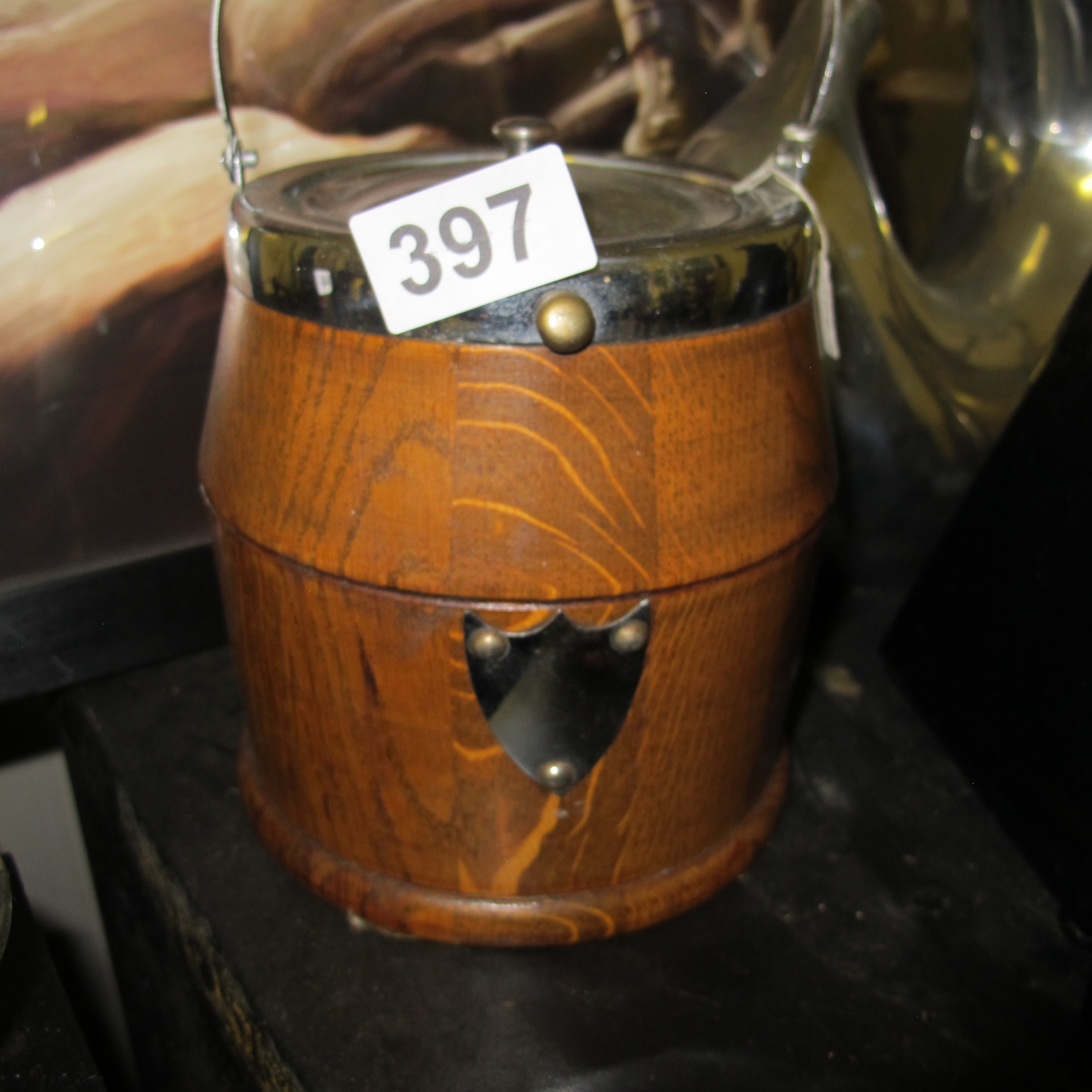 A Victorian Style Oak and Silver-plated Biscuit Barrel