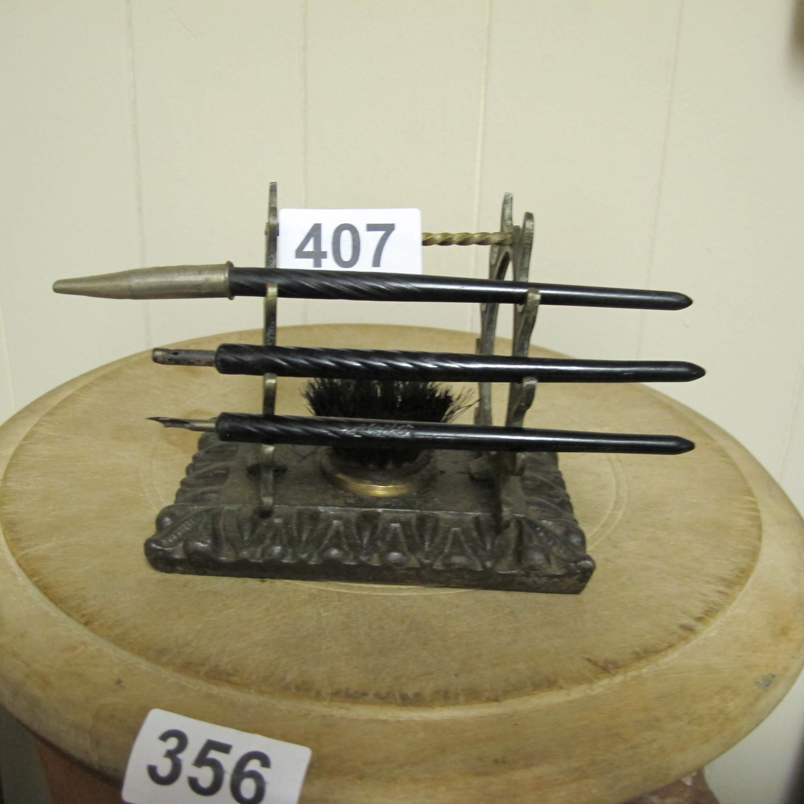 A Trio of Victorian Style Writing Instruments on a Cast Metal Desk Stand