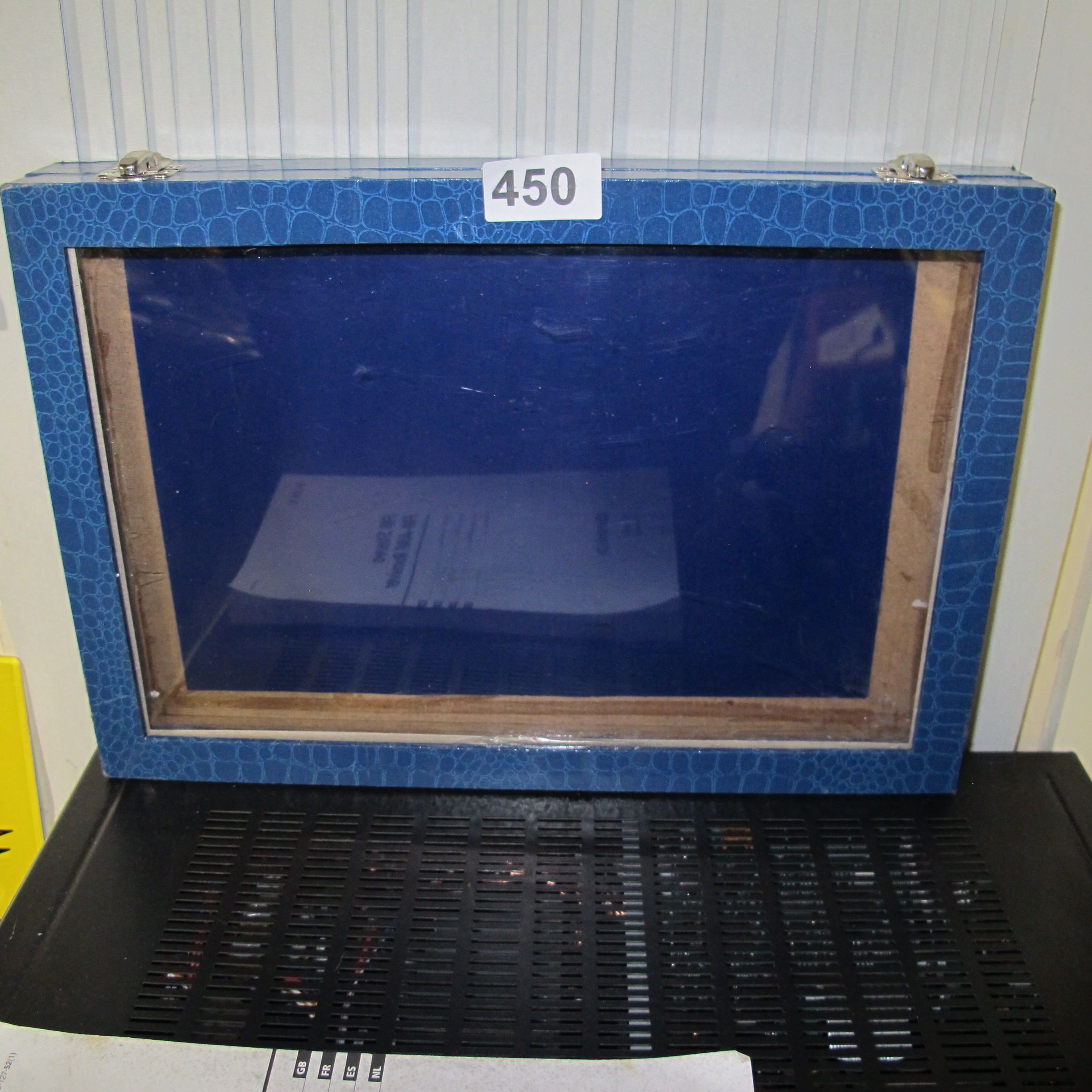 A contemporary blue faux-crocodile skin display case