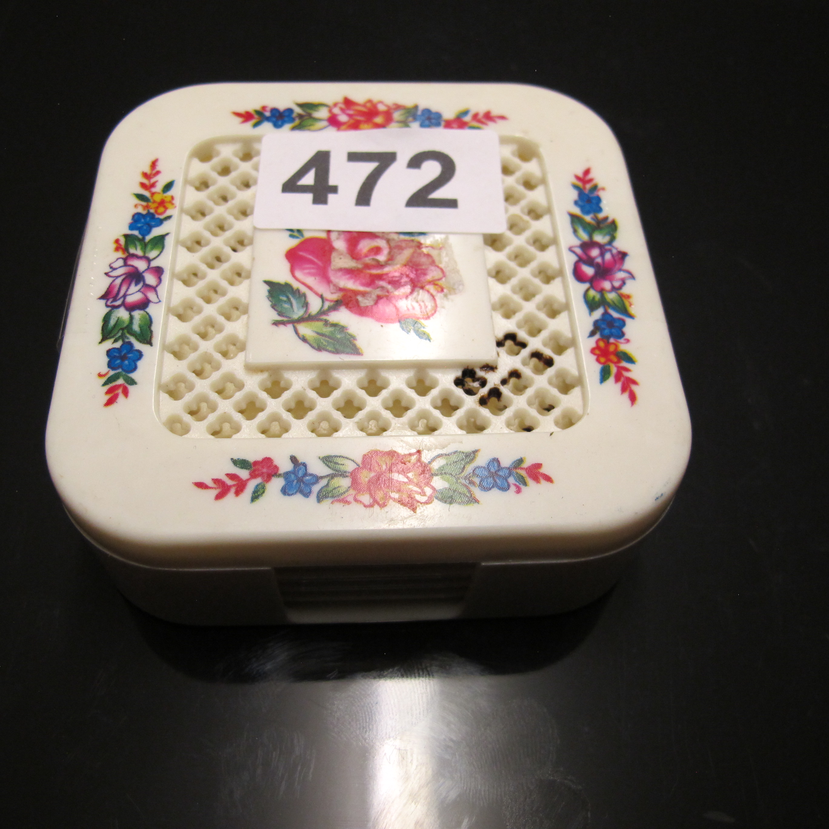 A Floral Decorated Moulded Plastic Coaster Set and Holder