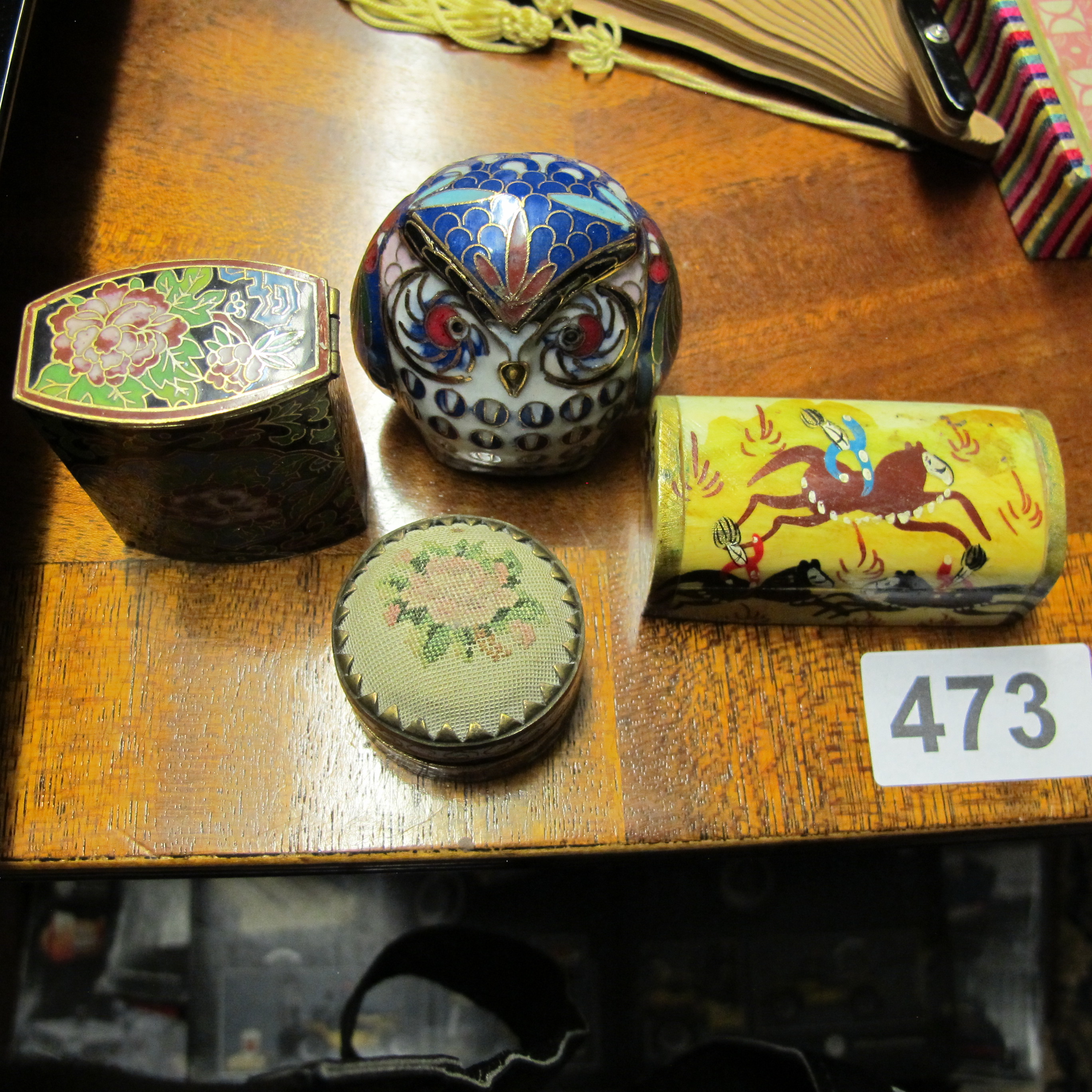 A collection of four decorative items including cloisonne enamel and petit point examples