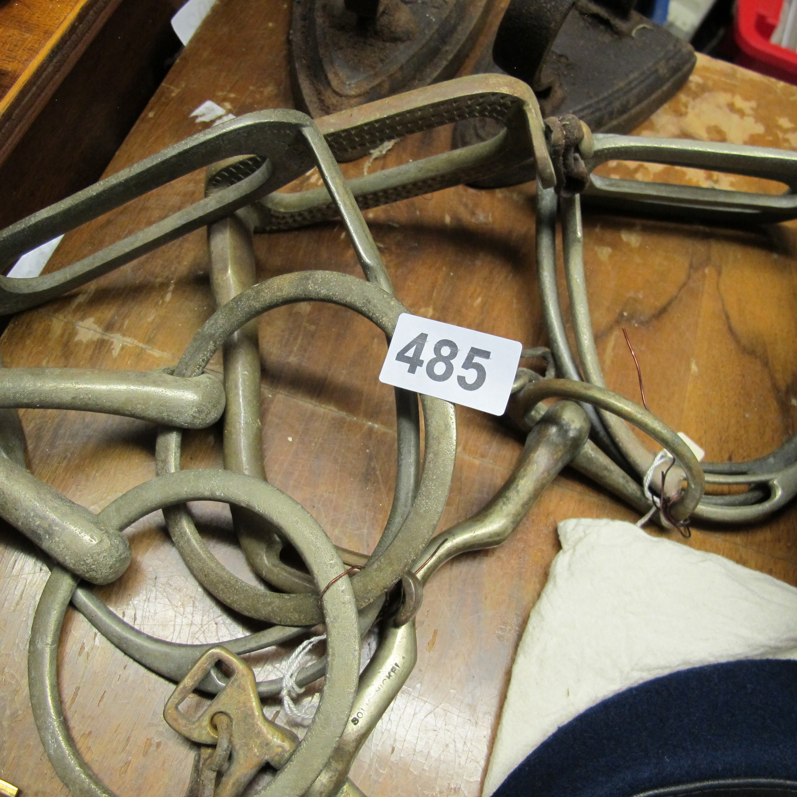 An Assortment of Vintage Cavalry Style Horse Bits, Stirrups, and Antique Cast Iron Flat Irons