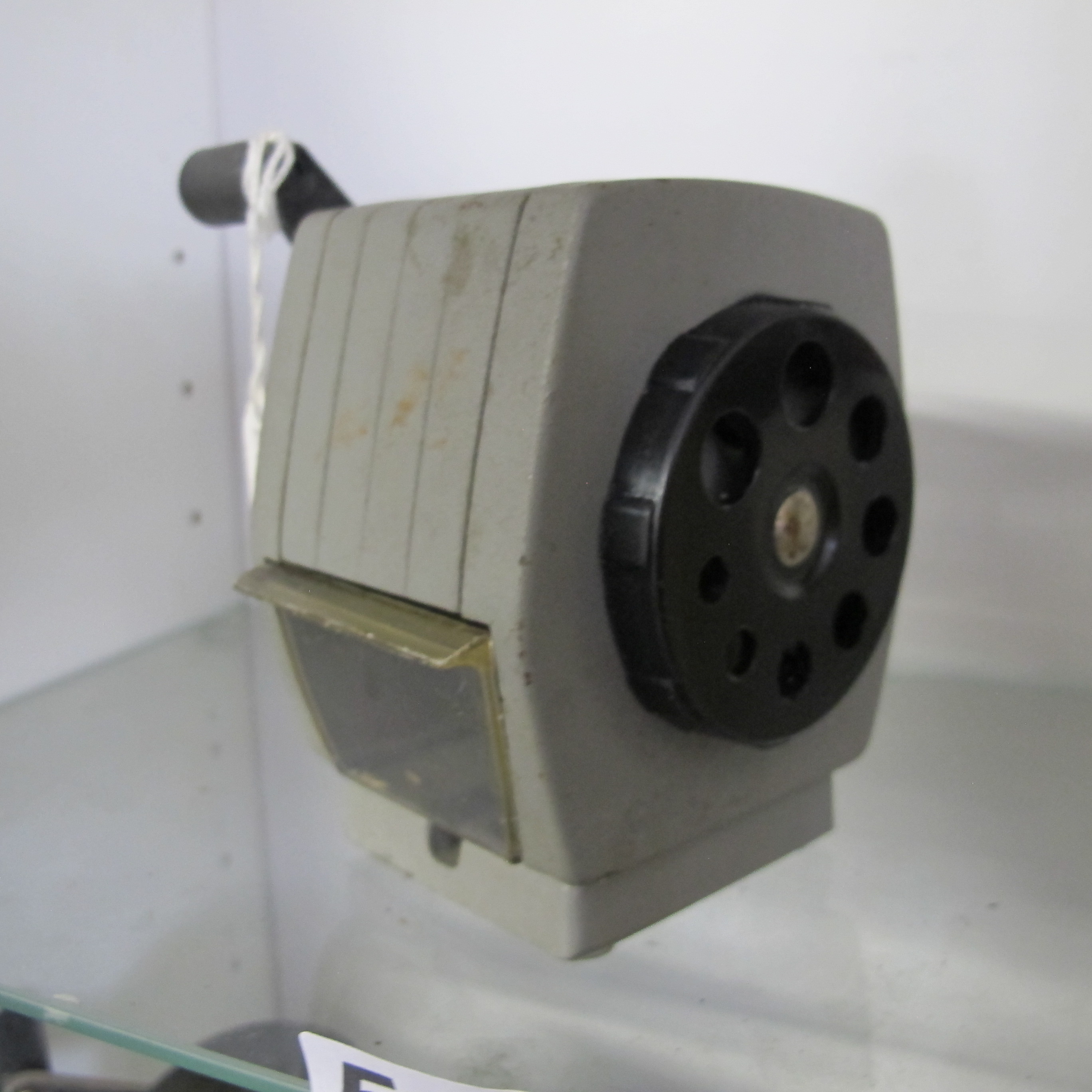 A vintage industrial manual crank-operated desktop pencil sharpener