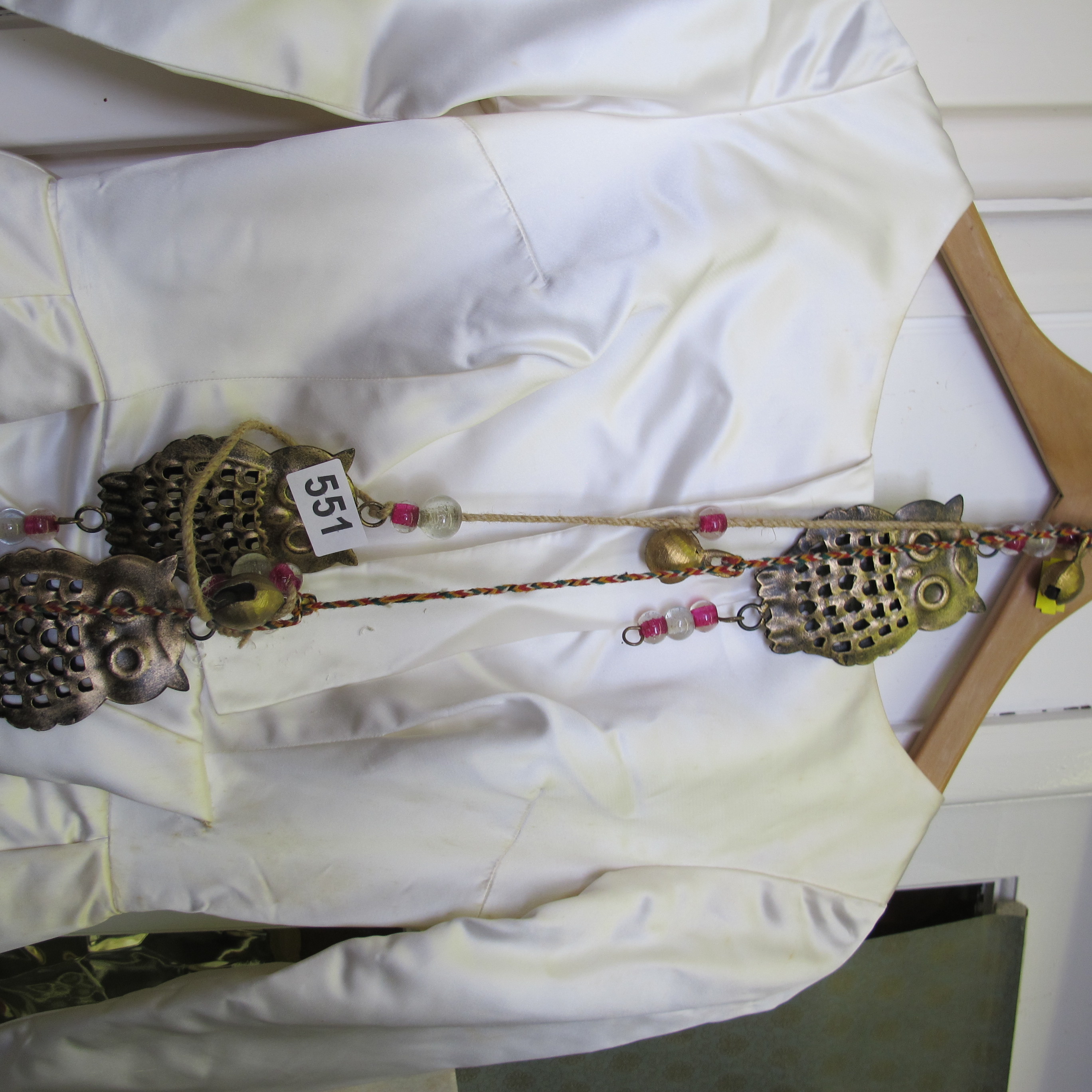 Two items comprising a mid-20th-century white satin bodice and a decorative brass-toned owl chime