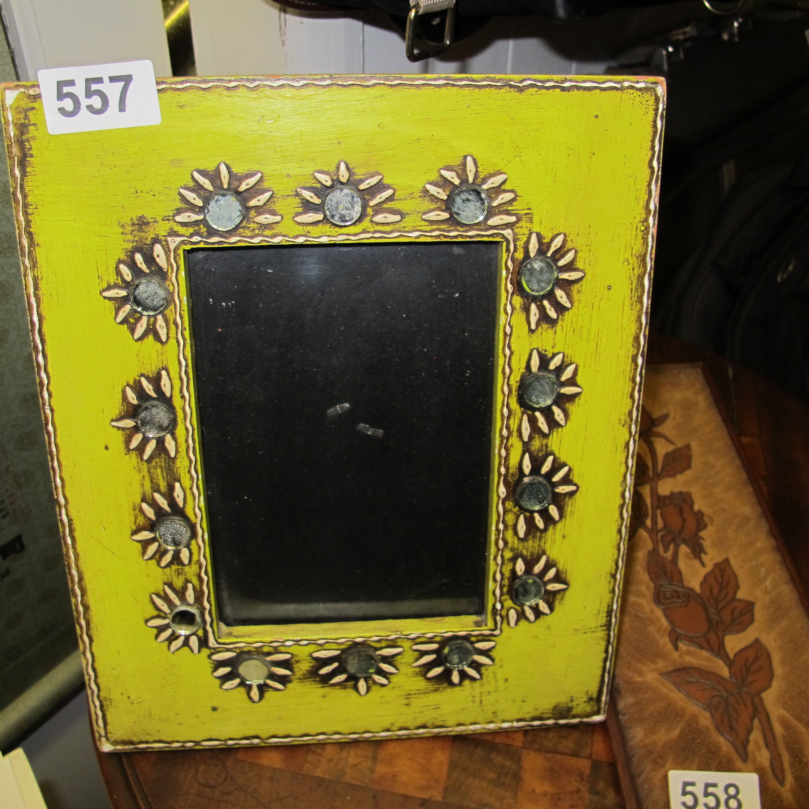 A contemporary rectangular wall mirror with distressed chartreuse green painted wooden frame and bone-inlay sunflower motifs