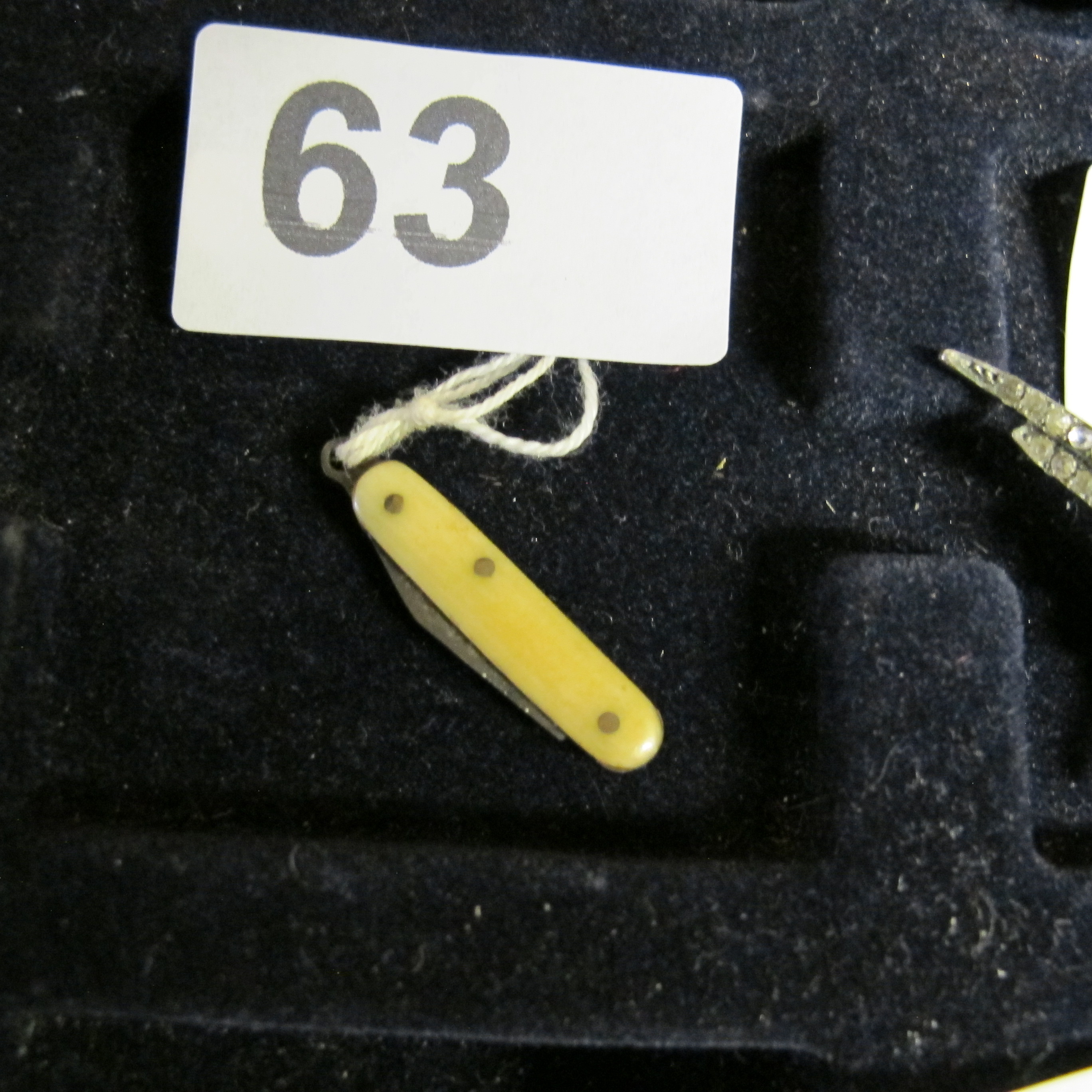 A miniature folding pocket knife watch chain charm with cream-coloured scales