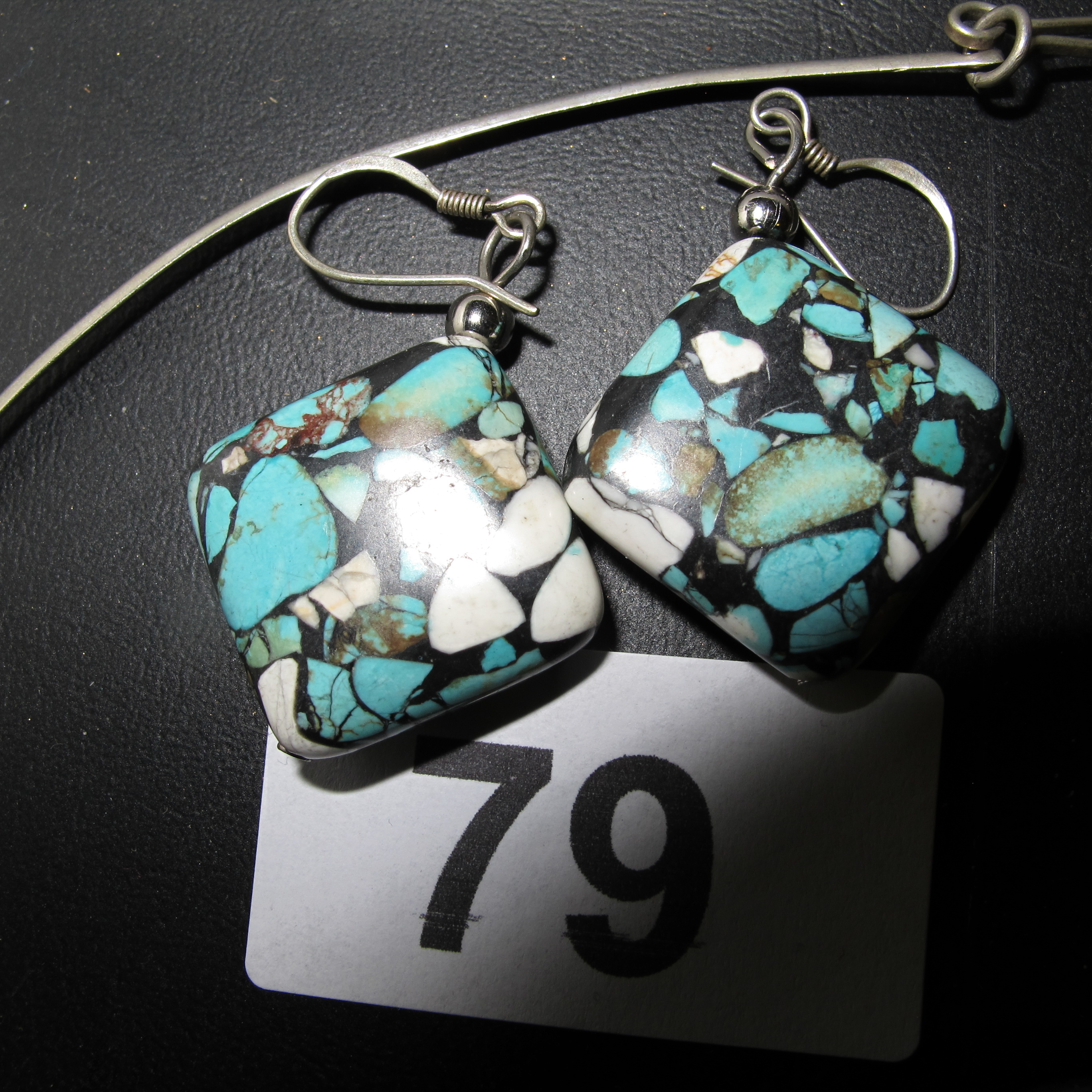 A Pair of White Metal and Composite Turquoise Mosaic Drop Earrings