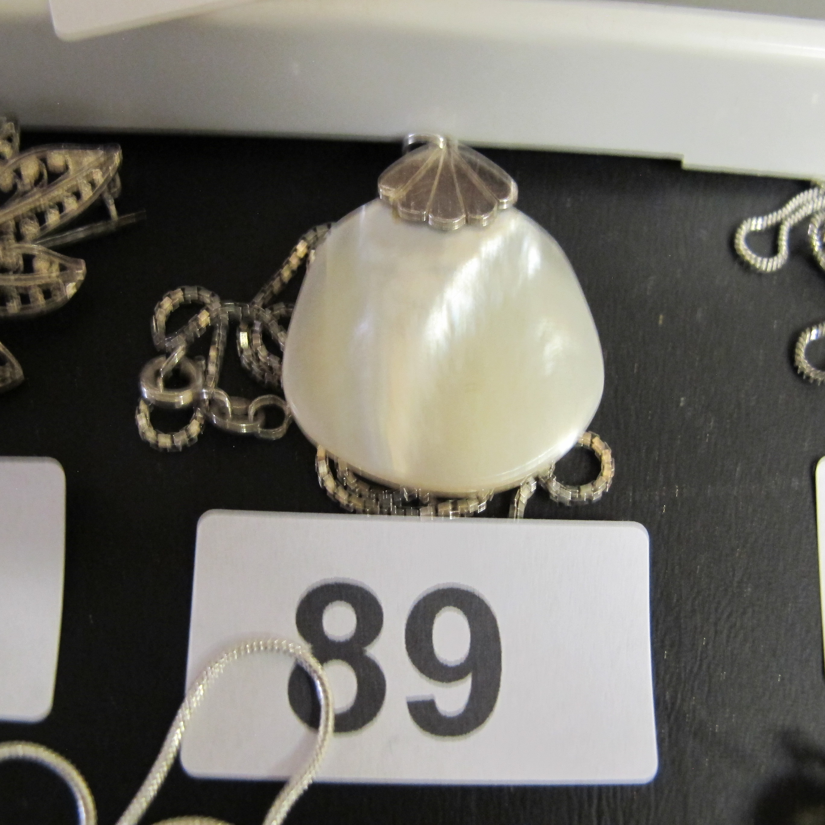 A Mother-of-Pearl Shell Pendant on a White Metal Box-Link Chain